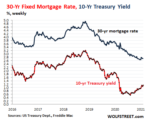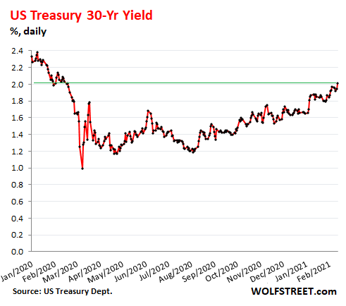 So maybe the Fed would crack down when inflation stays above 4% or 5% for a “while?” Once inflation has solidly set in, it’s hard to stop. That’s the rat the Treasury market is smelling, and if you’re sitting on a bond that yields 1.2% for the next 10 years, that’s not a mouthwatering item on the menu.