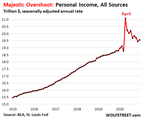 If you’re waiting for incomes to rise to trigger inflation, well, personal income shot up, as wages recovered as the highly paid switched to work-from-home and government stimulus and unemployment benefits layered money on top. This does not yet include the $600 stimulus check at the end of Dec early Jan, nor the potential future $1,400 stimulus check