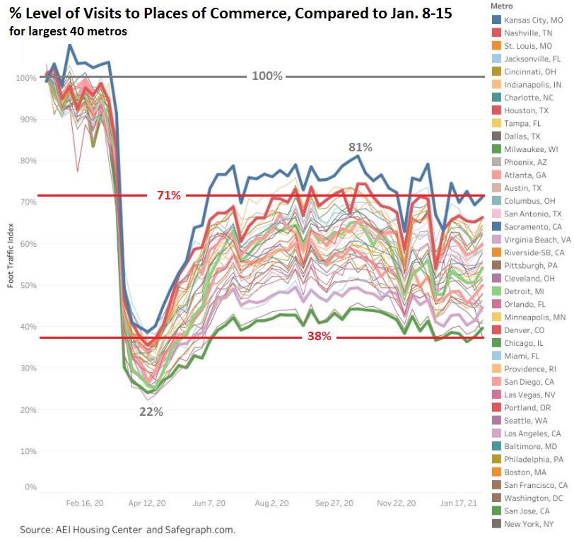 These “places of commerce” include offices, stores, malls, restaurants, hotels, movie theaters, airports, hospitals, other places of commerce and other points of interest in the 40 largest metro areas. The “Foot Traffic Index” measures how many people arrived at these locations, regardless of how they got there – by car, on foot, or by whatever other means.