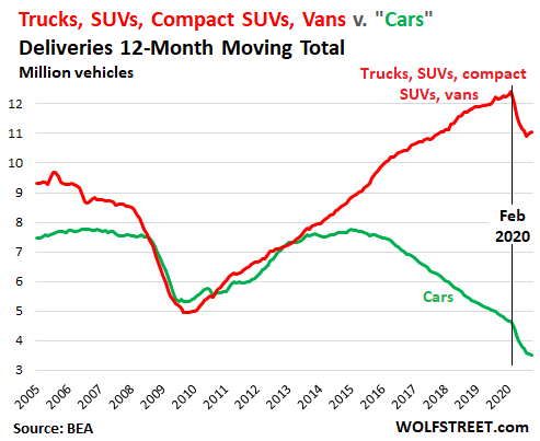 Carmageddon was the term I used for years, but stopped using about two years ago, to describe the collapse of “car” sales v. “truck” sales. And the collapse of “car” sales, as opposed to “truck” sales, continues. This is a chart I posted a few months ago (it’s no longer current):
