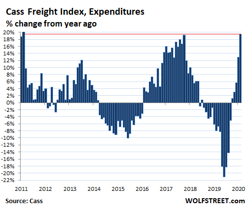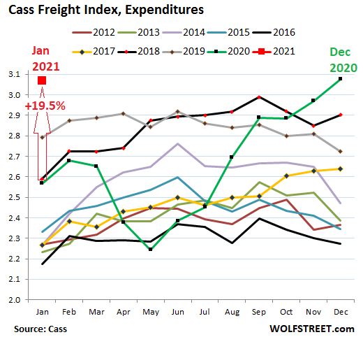 The amount that shippers, such as retailers and manufacturers, spent in January on shipping goods to their customers soared by 19.5% compared to January last year, the steepest year-over-year increase since 2011, and surpassing the surge in September 2018, according to the Cass Freight Index of Expenditures. This was driven by a mix of increasing freight volume and soaring freight rates: