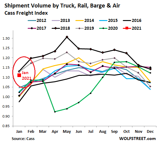Shipment volume in January jumped 8.6% year-over-year, but January 2020 had been weak and was still part of the two-year freight recession.
