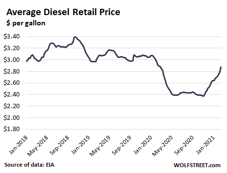 Now there’s another factor goosing freight costs. Diesel retail prices started to rise late last year. In the week through February 15, the national average retail price for No. 2 diesel rose to $2.88 per gallon, according to the EIA, up 20% from November 2020.