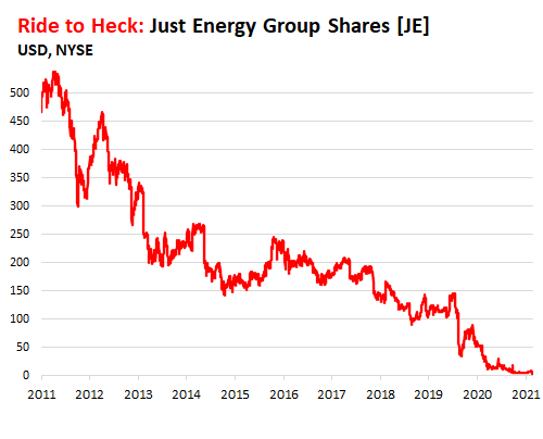 Its shares [JE] plunged 31% to close at $3.96 on the NYSE today. But Just Energy has long been dogged by issues, including five years of declining revenues that in 2020 were down by 32% from 2016; and steep losses in 2019 and 2020. Its shares have been on a long-term death spiral, where the 31% plunge today – from $5.77 to $3.96 – barely registers (stock data via YCharts):