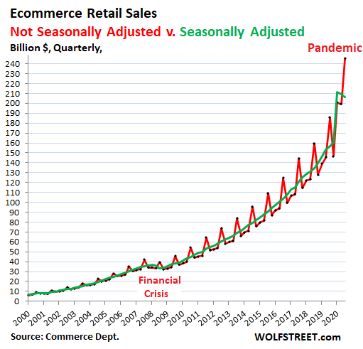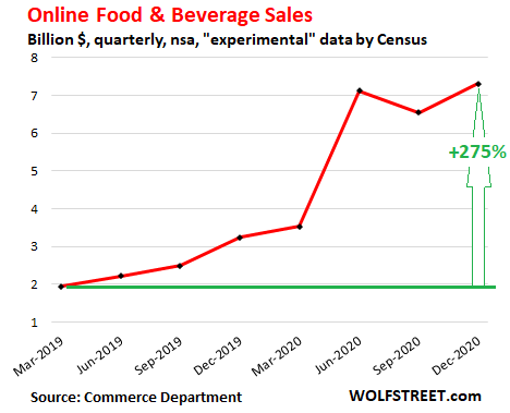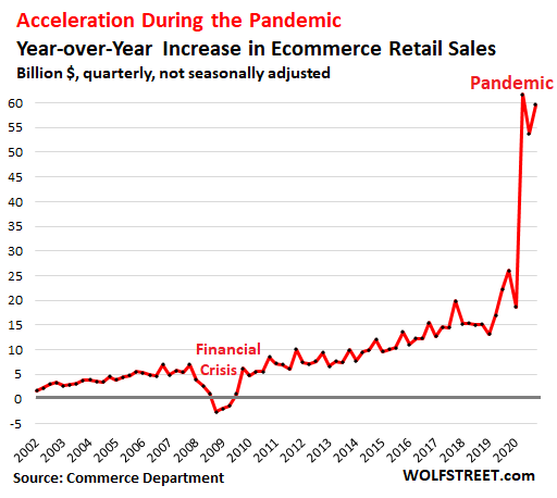 In terms of dollars, the last three quarters – the Pandemic quarters – show the accelerated shift to ecommerce sales with gigantic year-over-year jumps in the range of $55 billion to $61 billion, including by $60 billion in Q4: