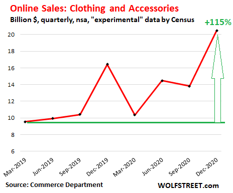Best Buy [BBY], which benefited from work-from-home and learn-from-home equipment purchases, hasn’t reported Q4 yet. But in Q3 it reported that online sales soared by 174% year-over-year to $3.8 billion, nearly tripling from $1.4 billion a year earlier, and accounting for 35% of its total sales.