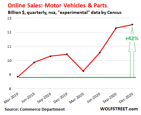 Ecommerce sales of motor vehicle and parts dealers rose by 42% since Q1 2019, to $13 billion, with a concentration on used vehicles, including by several online-only used vehicle retailers, such as Vroom and Carvana: