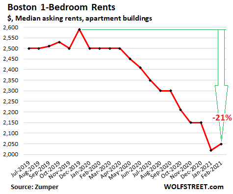 In Boston, the median 1-BR rent, after plunging in January, ticked up in February to $2,050, still down 18% from a year ago and 21% from the peak in December 2019: