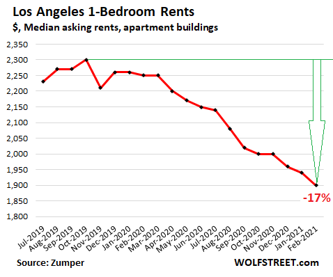 In Los Angeles, the 1-BR asking rent dropped further in February, to $1,900, down 16% from a year ago, and down 17% from the peak in October 2019: