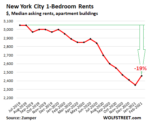 In New York City, the median asking rent for 1-BR apartments bounced off the multi-year low in January, to $2,460, but was still down 18% from a year ago, and 19% from July 2019.