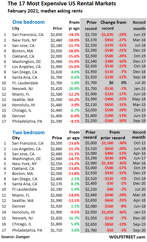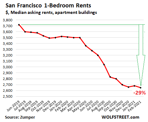 In San Francisco, the most expensive rental market in the US, the breath-taking downward spiral, after an uptick in January, ticked down to a new multiyear low in February, according to data from the Zumper National Rent Report: The median one-bedroom rent declined to $2,650, down 24% from a year ago and down 29% from June 2019: