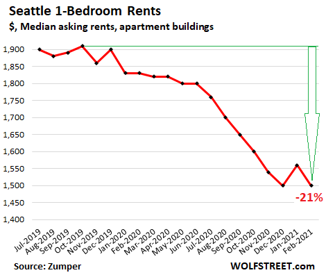 In Seattle, the lonesome uptick in January, after spiraling down for months, was neatly undone in February, with the asking rent for 1-BR apartments dropping back to $1,500, down 16% from a year ago, down 21% from October 2019, and down 25% from the peak in May 2018.