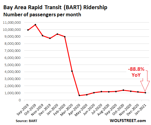 Many of the rail systems are still reporting declines in ridership of 80% or 90%. For example, the Bay Area Rapid Transit (BART) system, whose network connects the East Bay and parts of Silicon Valley to San Francisco, reported that in January 2021, ridership at 1.045 million passengers, was still down 88.8% year-over-year, without much improvement in sight since the original plunge in April, making it a near-perfect example of an L-shaped recovery. Americans have wholesale abandoned mass transit systems: