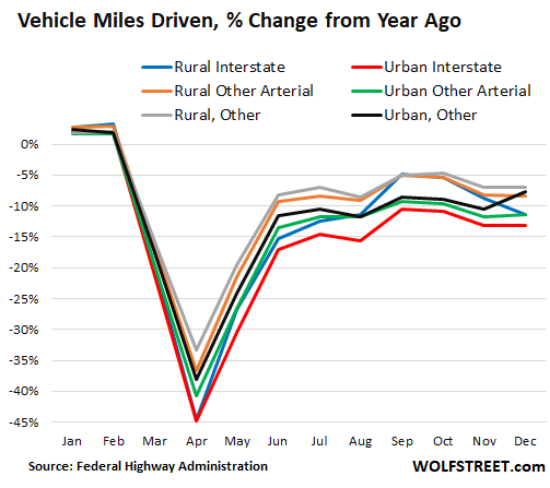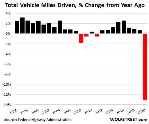 And the drop in 2020 makes the declines during the Great Recession, which had caused so much hand-wringing at the time, look minuscule. From the peak at the time in 2007 through the trough in 2011, over these four years, total miles driven dropped by only 2.6%.