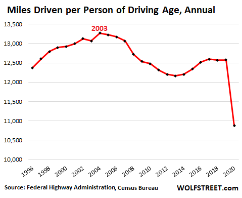 Total miles driven per person of driving age (people 16 years and older who are not institutionalized, such as in prisons, mental facilities, nursing homes, etc., per Census Bureau) had peaked in 2004 at 13,274 miles per year, and then went into a long decline, with a steep drop during the Great Recession that bottomed in 2012. After a shallow recovery came the Year of the Plague, when miles driven per person of driving age plunged to 10,870.