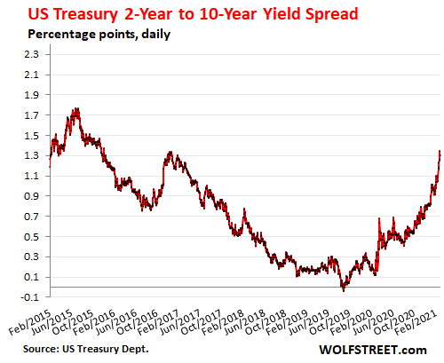 The yield curve as measured by the difference between the 2-year yield and the 10-year yield had been steepening sharply, with the 2-year yield glued in place, and with the 10-year yield taking off. On Friday, the spread between the two narrowed to 1.30 percentage points, from Thursday’s 1.35 percentage points, still making for the steepest yield curve by this measure since December 2016.
