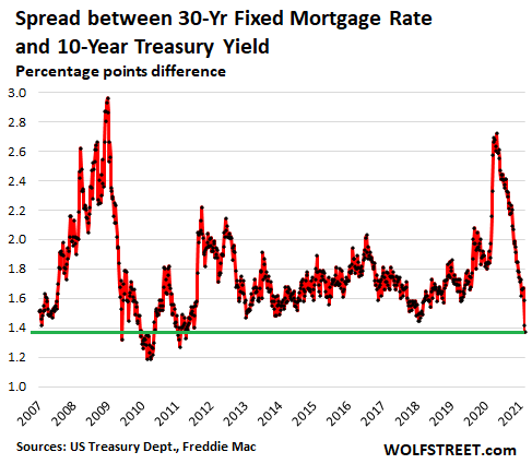 The 30-year mortgage rate normally tracks the 10-year yield fairly closely. But in 2020, they disconnected. When the 10-year yield started rising in August, the mortgage market just ignored it, and mortgage rates continued dropping from record low to record low until early January, whipping the housing market into super froth.