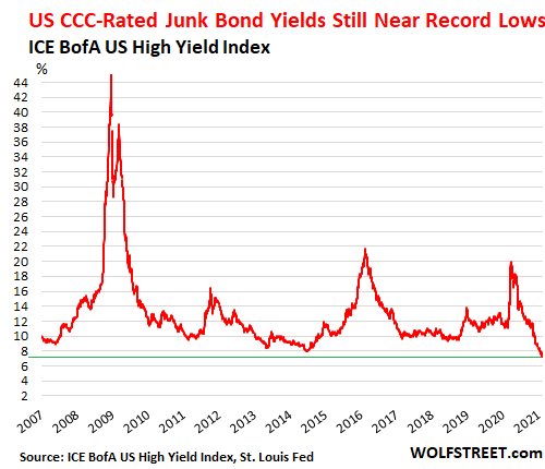 The fact that the highest risk bonds still sport yields that are near record lows is a soothing sign for the Fed. It means that financial conditions are still extremely easy. All kinds of high-risk companies with crushed revenues and huge losses – think cruise lines with near zero revenues and losses out the wazoo – can fund their cash-burn by issuing large amounts of new bonds to over-eager yield-chasing investors, no problem.