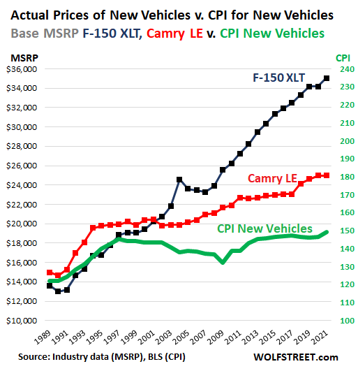 The power of these hedonic quality adjustments is demonstrated by my now equally infamous price index that compares the new vehicle CPI (green line) to prices of the F150, best-selling truck in the US, and the Toyota Camry, best-selling car in the US (I discuss the mechanics of these hedonic quality adjustments on new vehicles in detail here):