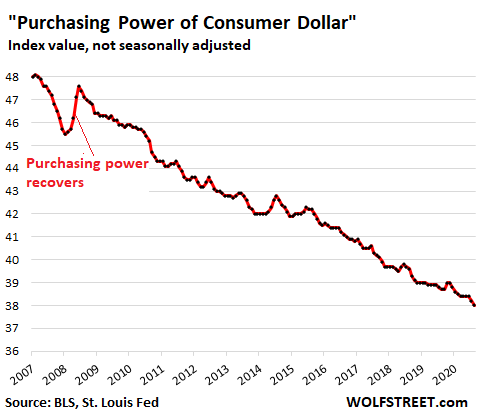 The politically incorrect term for consumer price inflation, which is what CPI tracks, is “loss of purchasing power of the consumer dollar,” and thereby the loss of purchasing power of labor denominated in dollars. And the purchasing power of the consumer dollar has dropped to a new all-time low in February, according to the BLS data today: