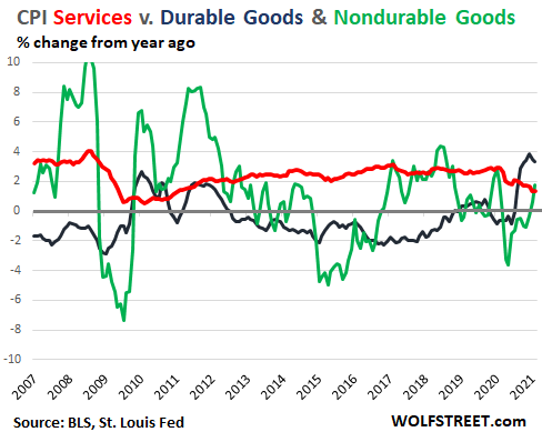 CPI for nondurable goods (green line) rose 1.7% from a year ago, the steepest increase in 12 months, after having dropped during the Pandemic amid collapsing prices of gasoline and other fuels. This category is dominated by the volatile prices of food and energy.