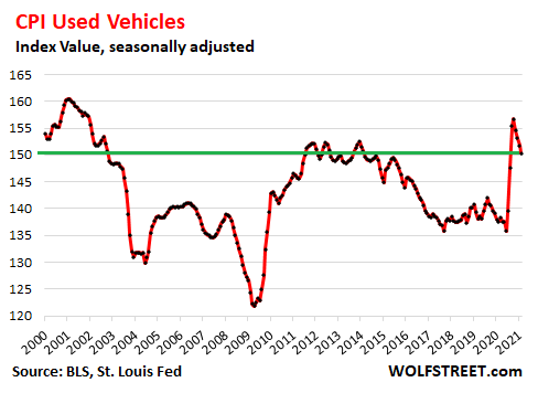 But the method of how CPI is figured makes sure that, even as used vehicles get more expensive every year, the index value of the CPI for used vehicles, after various ups and downs, has actually fallen since the year 2000, thanks largely to the infamous hedonic quality adjustments.
