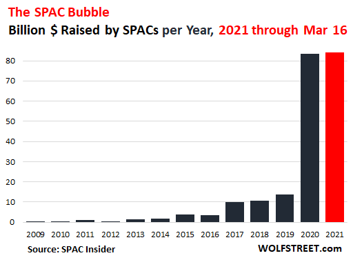 This arduous scrutiny was put in place to protect IPO investors. However, investors don’t give a hoot about protections anymore in the current mega-bubble craze. No one gives a hoot about anything anymore as long as this stuff goes up. See cryptos and NFTs, and well SPACs.
