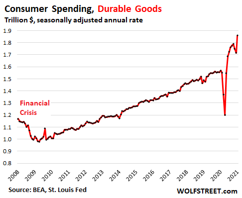 Then came the historic spike in demand for durable goods, powered by stimulus payments and the shift of consumer spending from services – flights, hotels, cruises, theaters, sports events, restaurants, and the like – to durable goods, such as appliances, laptops, video consoles, smartphones, computerized exercise equipment, and new vehicles. And they all have lots of semiconductors in them. And it had this effect: