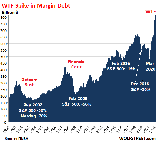 In the current craze that encompasses everything from sneakers and NFTs to stocks, where valuations don’t matter because of widespread certainty that valuations will be even greater in a few days, and where folks are chasing lottery-type returns, supported by the Fed’s interest rate repression and $3 trillion in asset purchases, and by the government’s trillions of dollars of handouts and bailouts – well, in this perfect world, there is a fly in the ointment: Vast amounts of leverage, including stock market leverage.