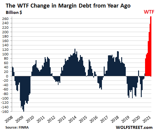 In February, margin debt jumped by another $15 billion to $813 billion, according to FINRA. Over the past four months, margin debt has soared by $154 billion, a historic surge to historic highs. Compared to February last year, margin debt has skyrocketed by $269 billion, or by nearly 50%, for another WTF sign that the zoo has gone nuts: