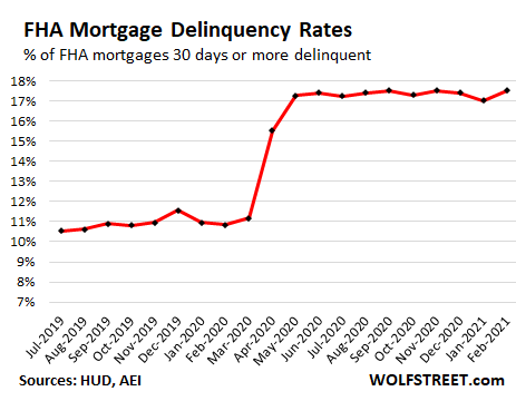 On the other side of the red-hot housing market, a historic delinquency problem has been fermenting since last spring, largely put on ice and on hold by forbearance programs, waiting to be dealt with. The Federal Housing Administration (FHA) which insures nearly 8 million high-risk mortgages, reported that the delinquency rate of its mortgages rose to 17.5% in February, up from 17.0% in January, matching the all-time records of September and November last year, according to the AEI’s Housing Center.
