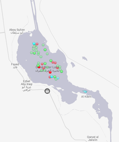 In the Great Bitter Lake, about a quarter of the way into the 120-mile-long Suez Canal from the Gulf of Suez, about three dozen ships are blocked and waiting to sail south (red dots = tankers; green dots = cargo ships; image via Maritime Traffic):