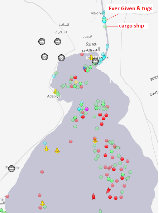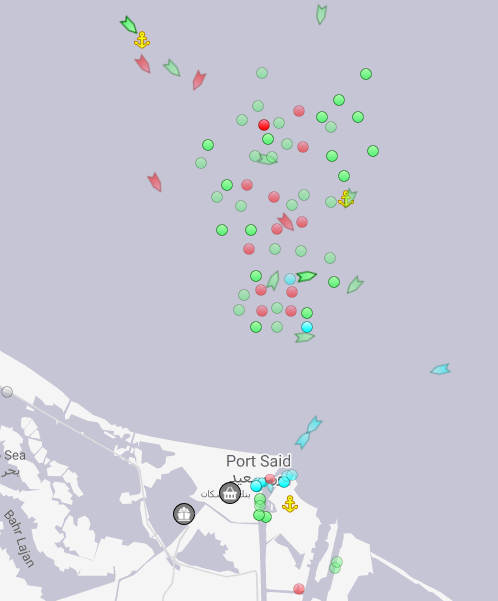 In the Port Said and the Mediterranean Sea, a bunch more ships are balled up waiting to sail south toward Asia (red dots = tankers; green dots = cargo ships):