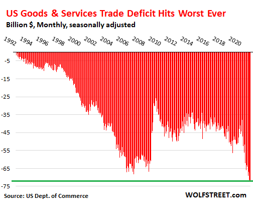The US trade deficit in goods and services with the rest of the world, after going from record to record, soared by, I mean worsened by 87% in February compared to February last year, to $71.1 billion, according to the Census Bureau today. As the trade deficit in goods hit another all-time record, the trade surplus in services, which was already small, plunged to a nine-year low:
