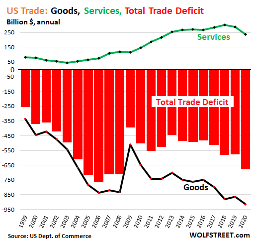 The US trade deficit in goods and services with the rest of the world, after going from record to record, soared by, I mean worsened by 87% in February compared to February last year, to $71.1 billion, according to the Census Bureau today. As the trade deficit in goods hit another all-time record, the trade surplus in services, which was already small, plunged to a nine-year low: