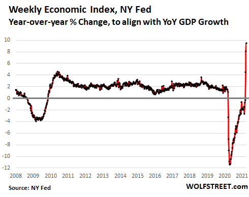 Today, the New York Fed released its latest Weekly Economic Index (WEI), one of the high-frequency measures that came out of the crisis. The index is based on ten daily and weekly indicators of real economic activity, compared to the same time last year, and is scaled to line up with year-over-year GDP growth. Last year, it fairly accurately predicted GDP growth, I mean plunge.