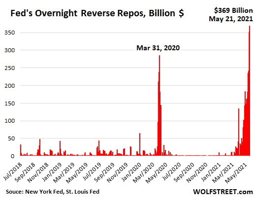 So with one hand, as part of QE, the Fed is buying $120 billion a month in Treasury securities and MBS. With the other hand, the Fed took back $351 billion via overnight reverse repos, undoing nearly three months of QE.