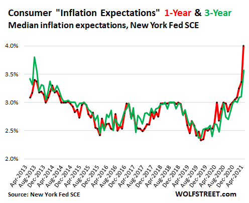 Alas, inflation expectations jumped to 4.0% for the 12-month outlook and to 3.6% for the three-year outlook, according to the New York Fed: