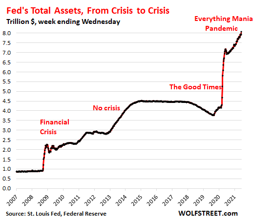 Over the 15 months since the money-printing craziness has started, the Fed has piled an additional $3.75 trillion in assets on top of its existing mountain, and has more than doubled its assets since September 2019, when the repo market blew out and triggered a massive bailout.