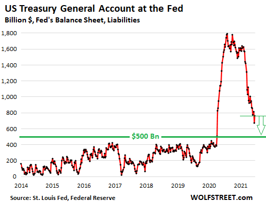 The Treasury Department draws down the TGA balance by spending more cash than it takes in through tax revenues and new debt issuance. The cash that the government thus spends was already monetized by the Fed last spring, but has been sitting in its TGA until it started entering the economy in February, when it too flooded the land with cash.