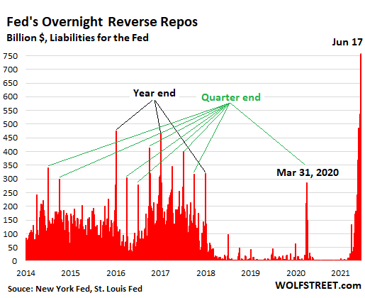 Holy Moly, Fed’s Reverse Repos Spike to $756 Billion, Undoing 6 Months of QE. In Opposite Direction, Fed’s QE Pushes Assets Past $8 Trillion