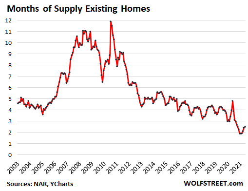 In May, 23% of the sales were all-cash, often an indication of institutional investors buying, down from 25% in April. In May 2020, all-cash deals were at 17% of total sales, according to the NAR. Heavy buying by investors has caught the attention of Dallas Fed President Robert Kaplan who pointed at it, and the distortions it causes, as a reason to taper the Fed’s purchases of MBS “sooner rather than later.”
