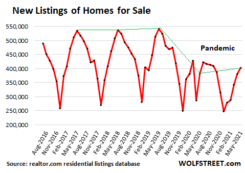New listings are slowly coming out of the woodwork. In May, new listings rose 5.8% from April, and 5.4% from May last year, to 403,000 homes, according to the realtor.com residential listings database, but are still about 140,000 new listings below the pre-Pandemic Mays (the months of May are connected by a green line).