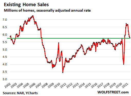 Despite inventories of homes listed for sale that have been rising for three months, sales of existing homes – single-family houses, condos, and co-ops – declined for the fourth month in a row, by 0.9% in May, from April, to a seasonally adjusted annual rate of 5.80 million homes, to the lowest sales rate since June 2020, according to the National Association of Realtors today. Compared to May 2019, sales were up 10.9%. Homes sales have now mostly unwound the extravagant spike that started last summer (historic data via YCharts):
