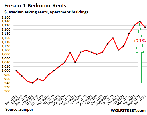 Fresno, an example of cheaper cities for Silicon Valley rent refugees, is closer to Yosemite National Park, Sequoia National Park, and Kings Canyon National Park than Silicon Valley. The median asking rent started soaring in early 2020 and then spiked earlier this year. Between January 2020 and May 2021, the median asking rent for 1-BR apartments soared 24%. But in June, that phenomenon reversed: