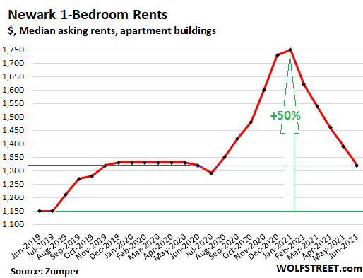 By December 2020, to the amusement and bafflement of WOLF STREET readers, the median asking rent in Newark had spiked 50% from July 2019, and 36% from July 2020, to catapult the market to the 9th most expensive rental markets in the US. And that spike, according to data from Zumper today, totally collapsed by June: