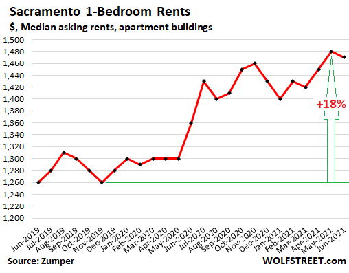 In Sacramento, an example of cheaper cities that San Francisco rent refugees fled to, the massive jumps in asking rents last summer hit resistance recently or maybe even began to unwind: