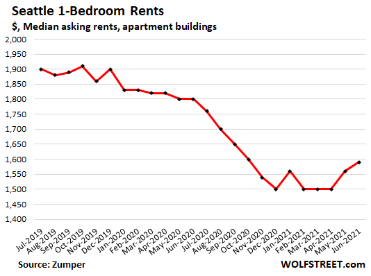 OK, sorta. The median asking rent for 1-BR apartments, at $2,790, is still down 25% from July 2019: