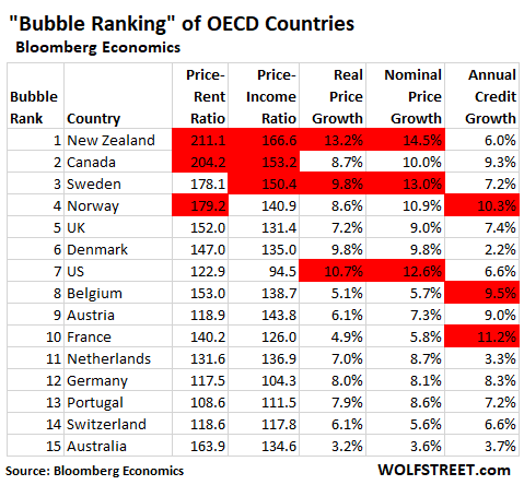 Here are the top 15 most splendid housing bubbles of the OECD, as per Bloomberg Economics Bubble Ranking. The red fields show the top three per indicator: