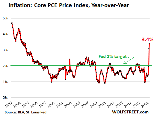 The Fed’s target of 2% is indicated by the green line. The Fed has specified that this target is “symmetrical,” meaning that it will let inflation run a higher than 2% for a while after it ran lower than 2% for a while. And so now we have a massive overshoot: